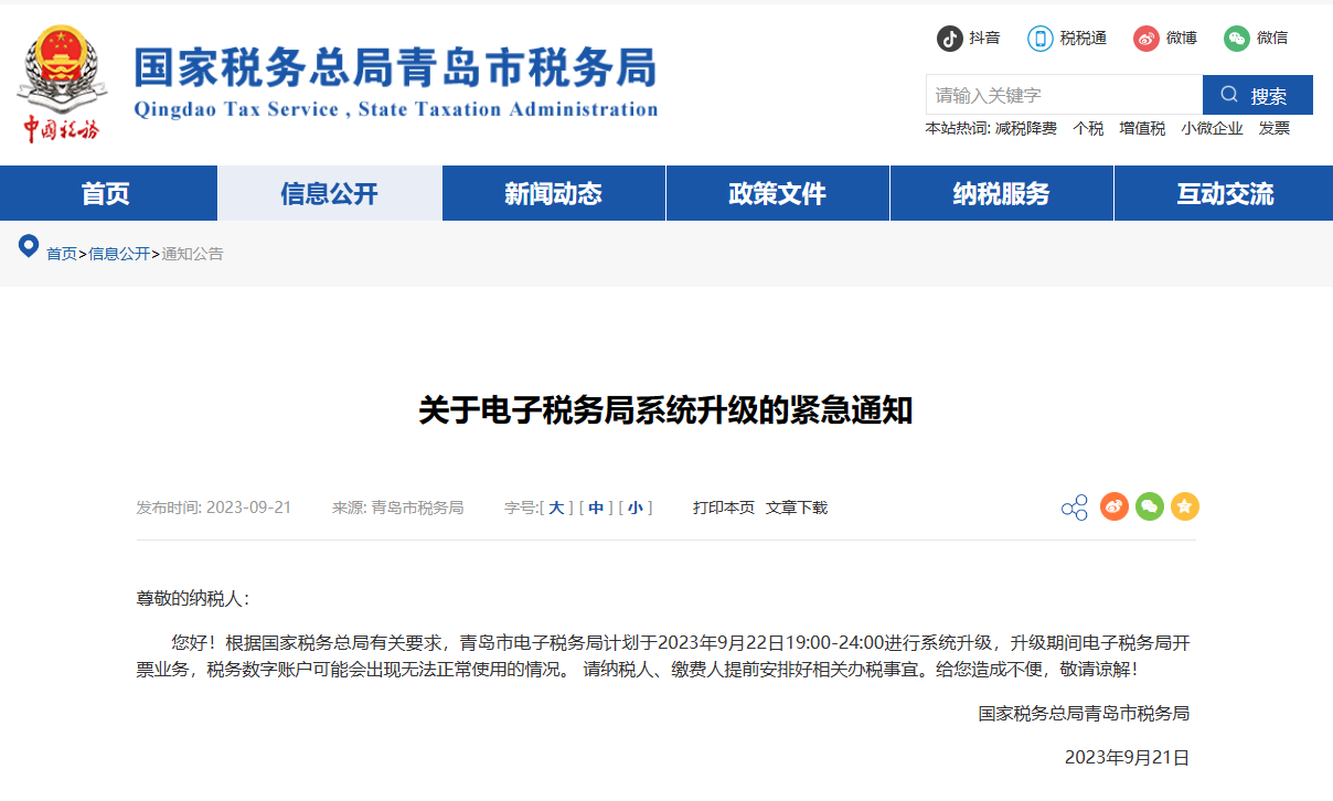 您好!根据国家税务总局有关要求,青岛市电子税务局计划于2023年9月22日19:00-24:00进行系统升级,升级期间电子税务局开票业务,税务数字账户可能会出现无法正常使用的情况。请纳税人、缴费人提前安排好相关办税事宜。给您造成不便,敬请谅解!