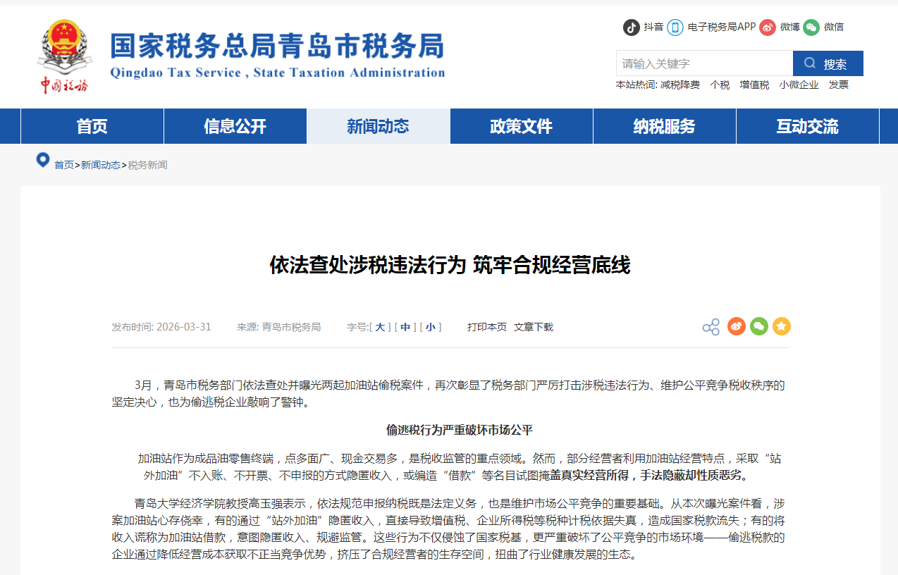 3月,青岛市税务部门依法查处并曝光两起加油站偷税案件,再次彰显了税务部门严厉打击涉税违法行为、维护公平竞争税收秩序的坚定决心,也为偷逃税企业敲响了警钟。